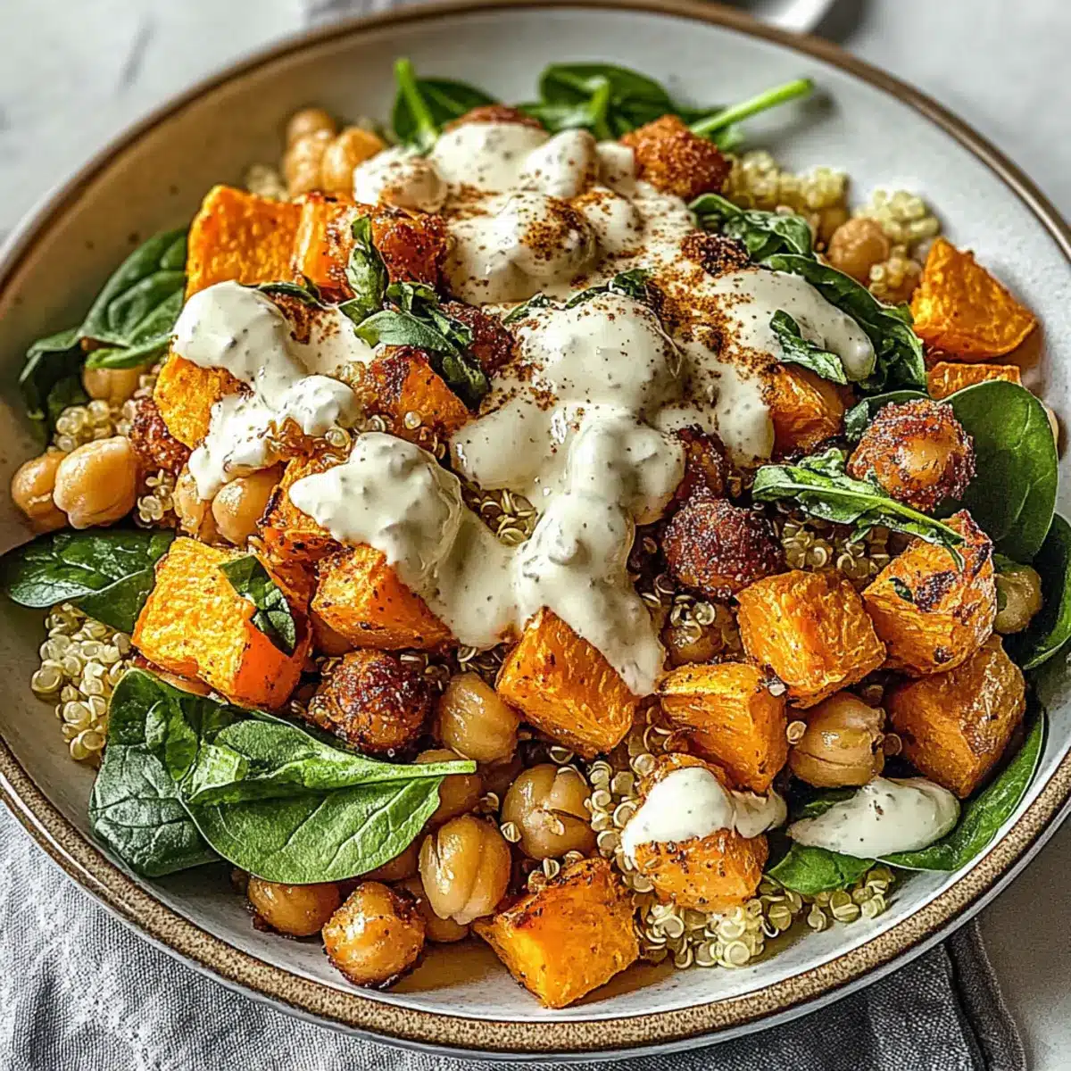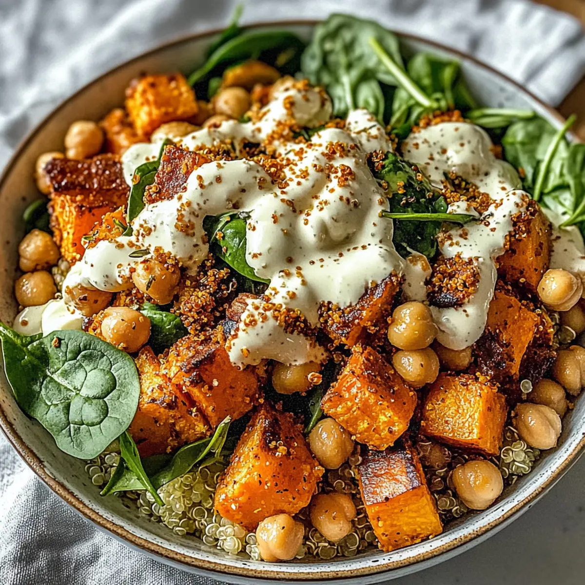 - Assemble bowls with quinoa, roasted sweet potatoes, sautéed chickpeas, spinach, and avocado. Drizzle with tahini yogurt sauce.
