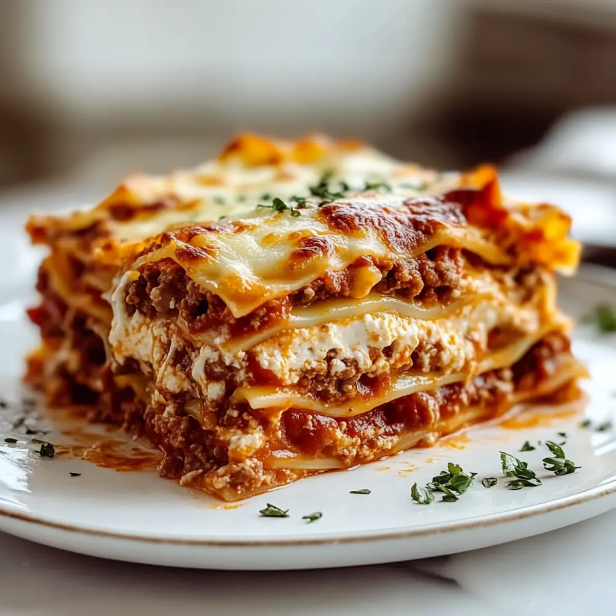 Once out of the oven, allow your lasagna to rest for 10-15 minutes before slicing. This essential step helps the layers maintain their shape when served. Garnish with freshly chopped parsley for a burst of color and flavor, making your plate of hearty beef and cheese lasagna not only delicious but visually appealing too!