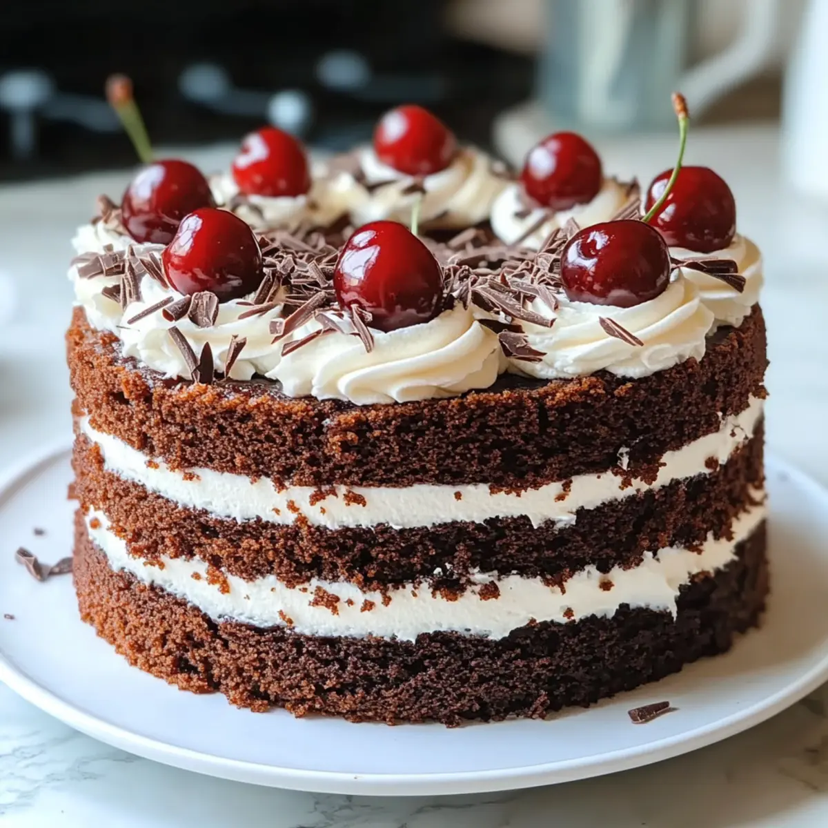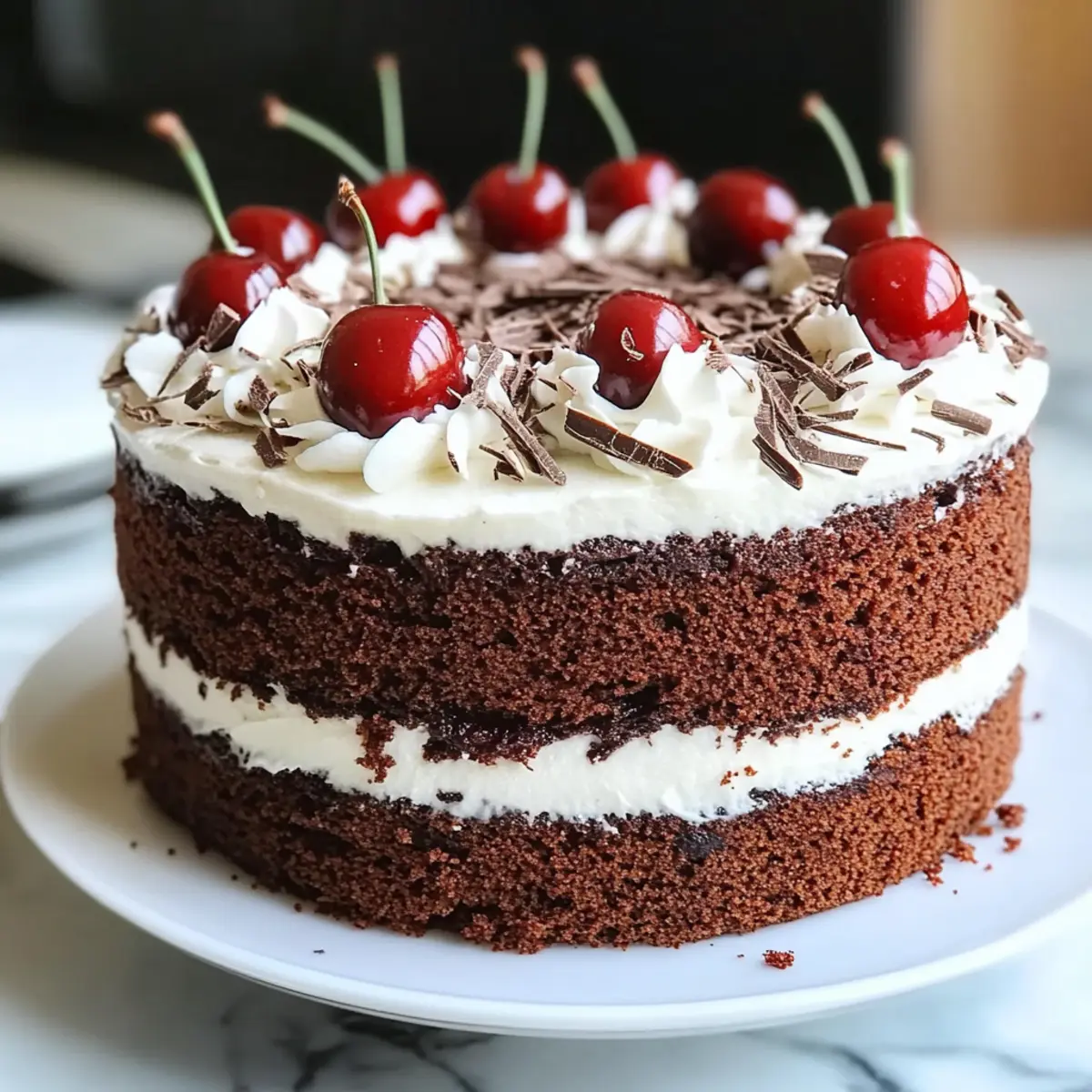 Frost the entire cake with the remaining whipped cream, spreading it evenly around the sides and on top. Decorate with chocolate shavings, made by peeling a chocolate bar with a vegetable peeler, and place fresh cherries on top for a delightful and elegant look you’ll love.