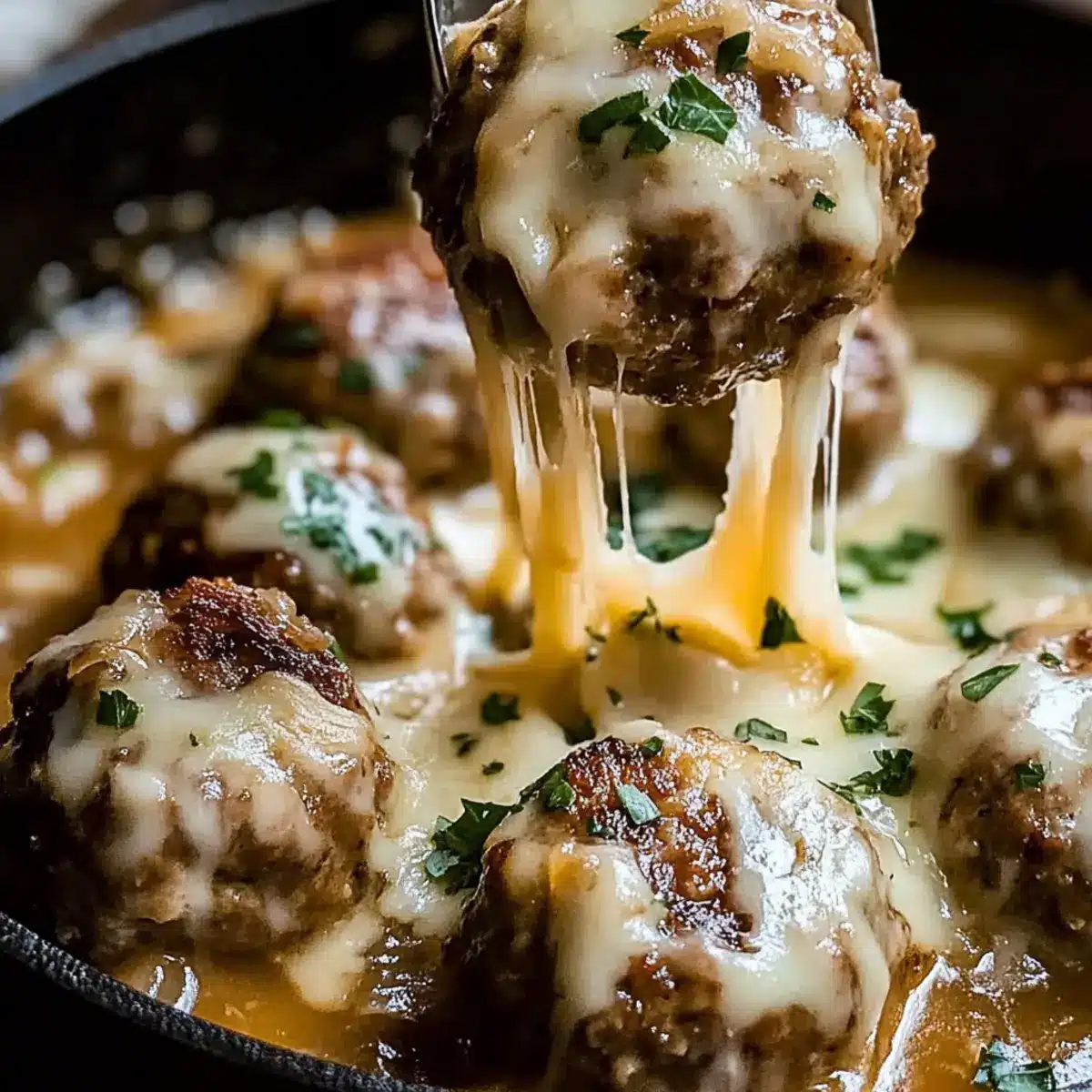 As I savored the last bites of my dinner, memories of cozy nights spent with family flooded back, evoking the comforting aromas of French onion soup wafting through my childhood home. Today, I’m thrilled to share a delightful twist on that iconic dish—Cheesy French Onion Meatballs. These gems combine the familiar, savory flavors we all adore, wrapped in tender meatballs and luxuriously drenched in a rich, caramelized onion sauce topped with gooey melted Gruyère cheese. Whether you’re hosting friends or looking for a satisfying weeknight meal, these meatballs are a true crowd-pleaser, marrying simplicity with sophistication. Plus, they’re easy to whip up, making them perfect for any occasion. Ready to dive into a comforting plate that combines nostalgia with a modern twist? Let’s get started!
