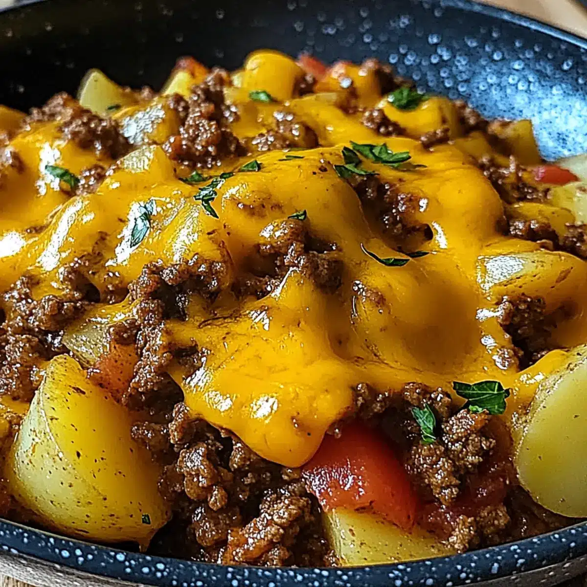 Finally, garnish the dish with the remaining parsley and a dash of chili flakes if desired. Serve your Cheesy One Pot Beef and Potatoes hot, allowing the comforting aromas to draw everyone to the table. Enjoy this delightful family meal that’s sure to warm everyone’s hearts!