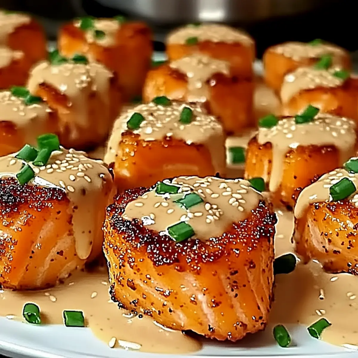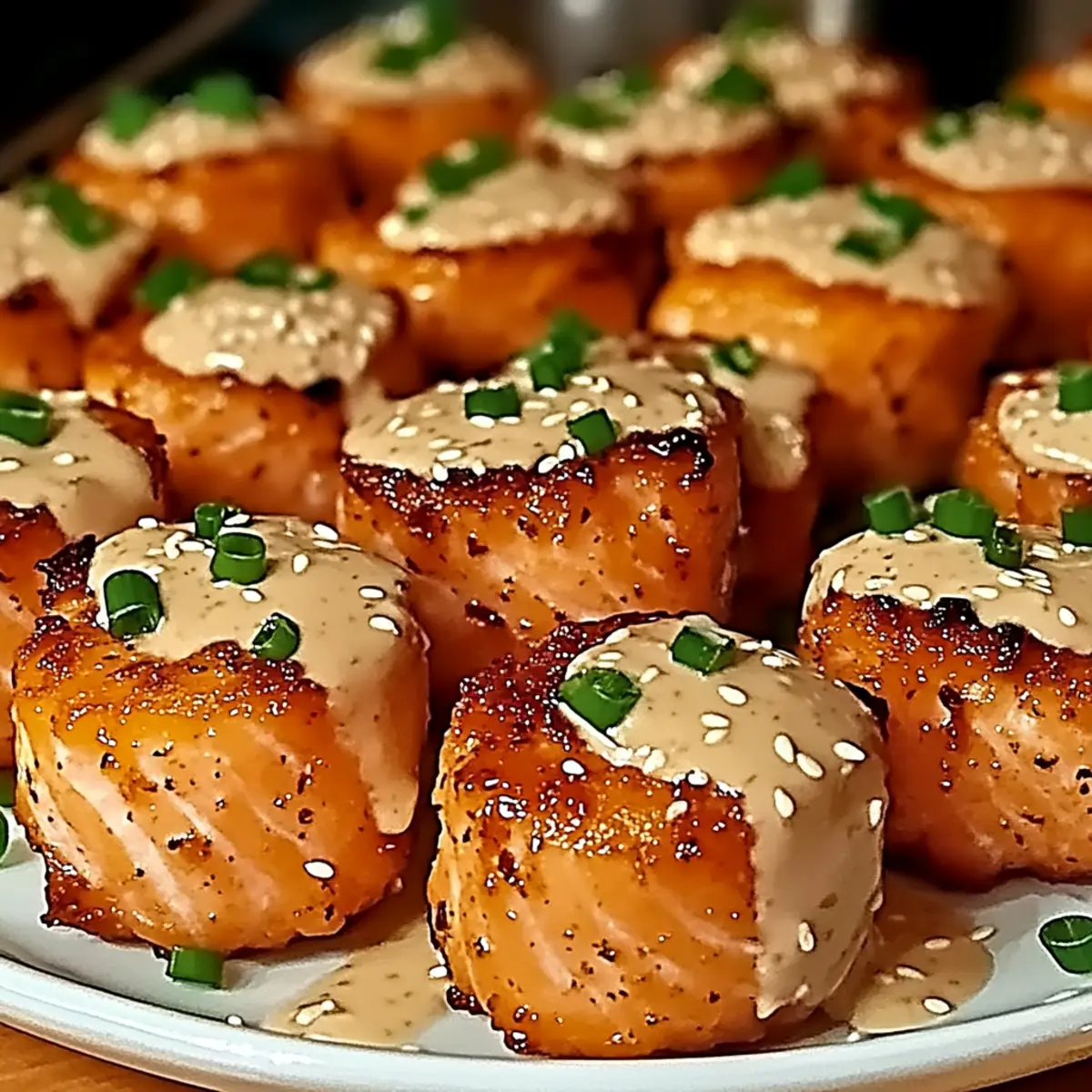 - Once your salmon bites are cooked, remove them from the heat. Drizzle or toss with the Bang Bang sauce until each piece is coated.