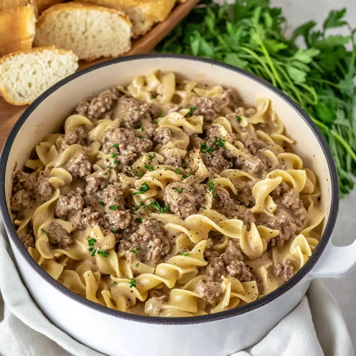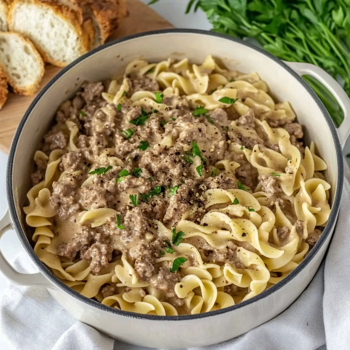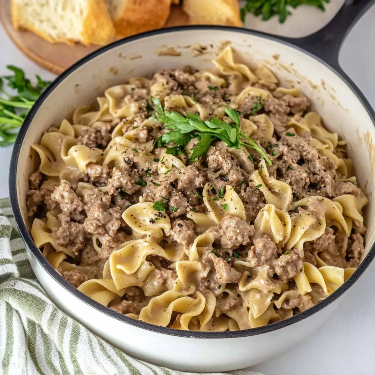 • Egg Noodles – The dish’s base, providing a satisfying texture; gluten-free pasta works well in this easy Ground Beef Stroganoff.