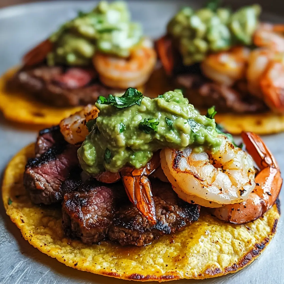 - Spread guacamole on tostada shells, top with sliced steak and shrimp, and drizzle with chipotle cream. Garnish with cilantro.