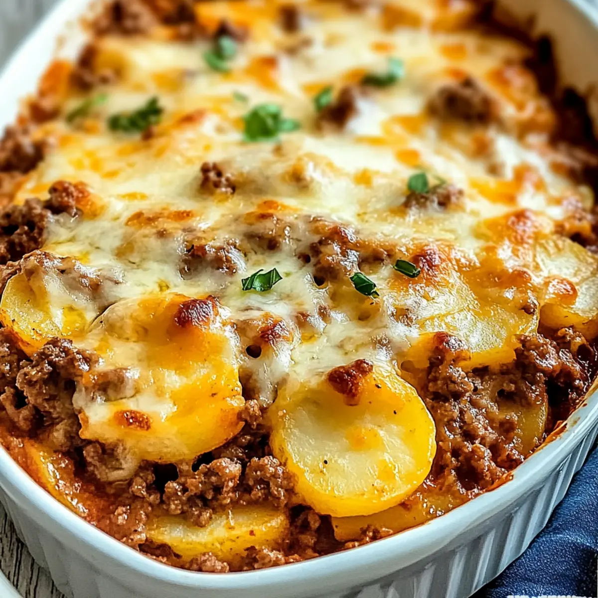 - Grease a 9x13-inch baking dish and layer half of the sliced potatoes, then half of the ground beef mixture, followed by half of the cheddar cheese. Repeat these layers.