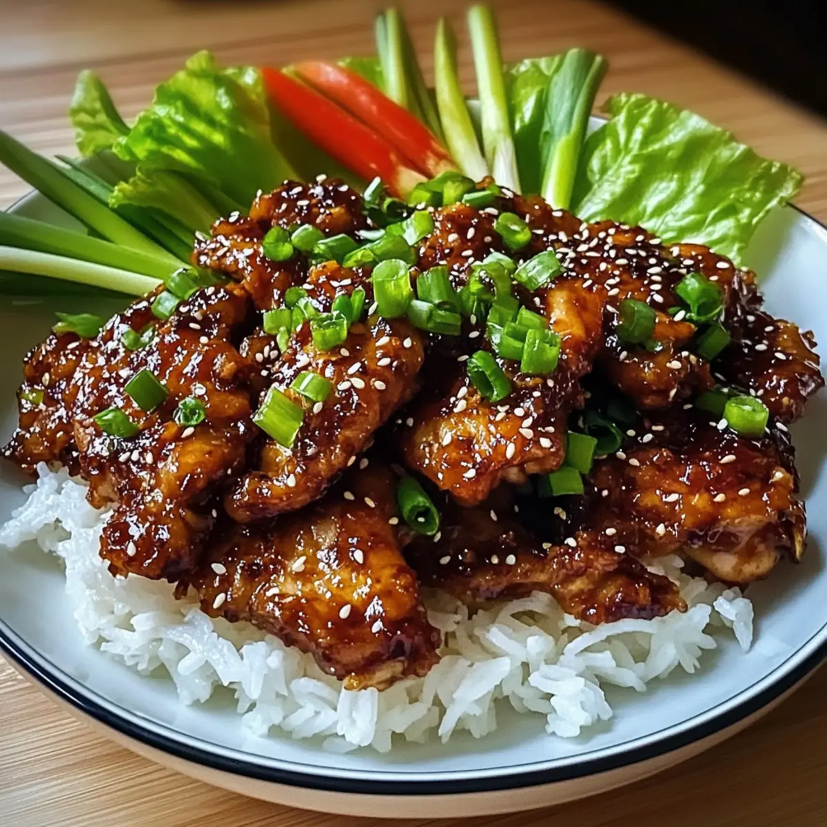 - Serve and Garnish: Serve chicken over rice, garnish with reserved green onions and sesame seeds. Optional: serve with lettuce leaves.