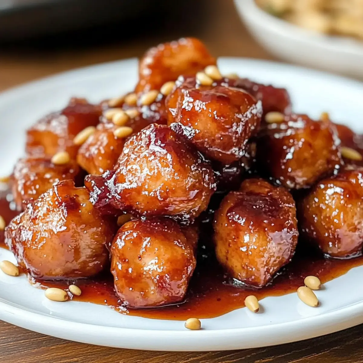 As the final touch, sprinkle toasted pine nuts over the glazed chicken bites just before serving. These crunchy gems add delightful texture and nutty flavor to the dish. Serve the Irresistible Cranberry Maple Glazed Chicken Bites hot, and watch as your family and friends relish every bite, savoring this festive dish.