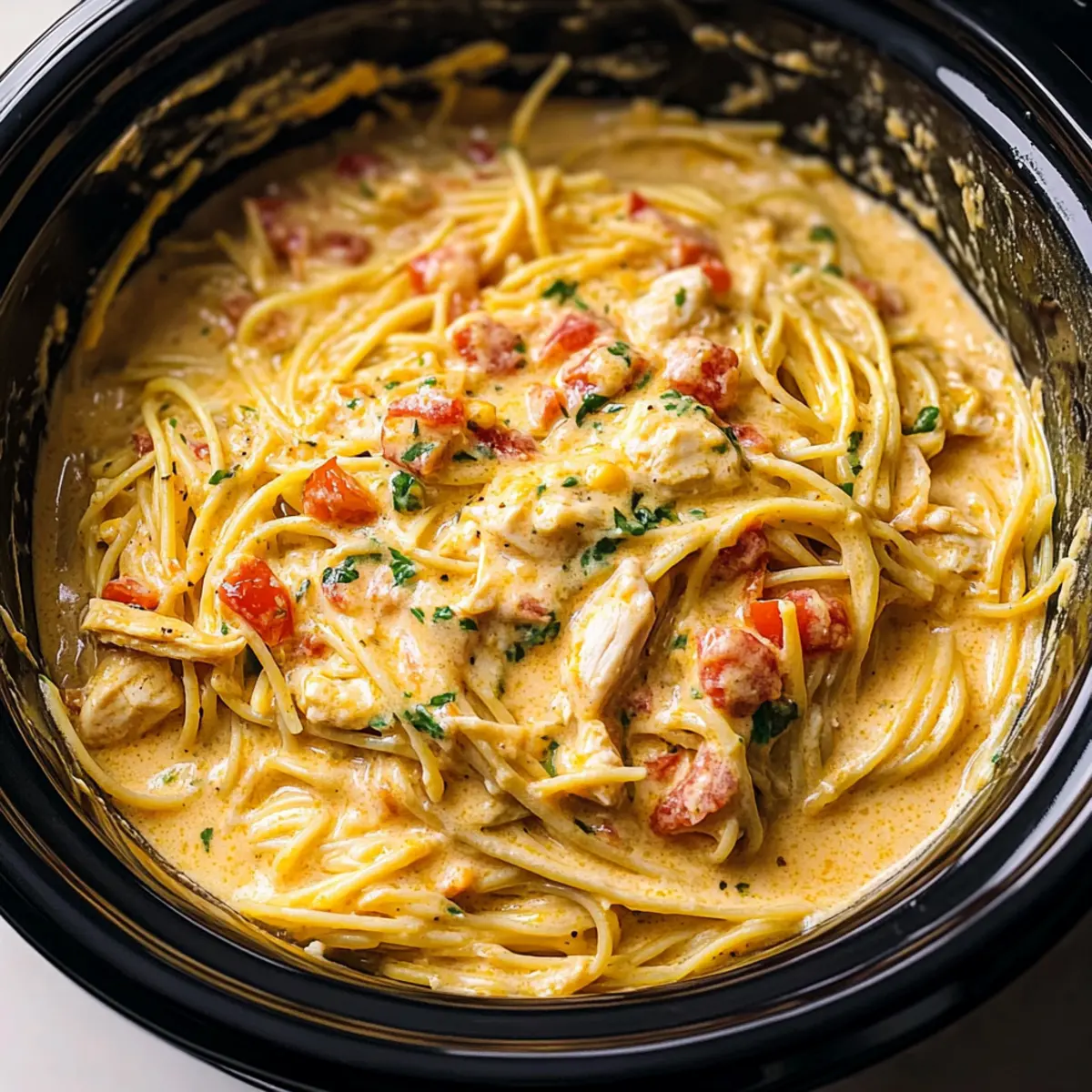 These Irresistible Crock Pot Cheesy Chicken Spaghetti ingredients are perfect for meal prep enthusiasts! You can prep your chicken and sauce up to 24 hours in advance by combining the seasoned chicken, sautéed aromatics, and sauce base in the slow cooker. Simply refrigerate the mixture overnight and let the flavors meld for a richer taste. When you’re ready to serve, just add the chicken mixture to the slow cooker and cook on LOW for 4-5 hours or HIGH for 2-3 hours. Cook the spaghetti fresh just before combining it with the cheesy mixture to maintain its texture—this way, you’ll enjoy the same creamy and comforting results with minimal effort, making your busy weeknights a delight!