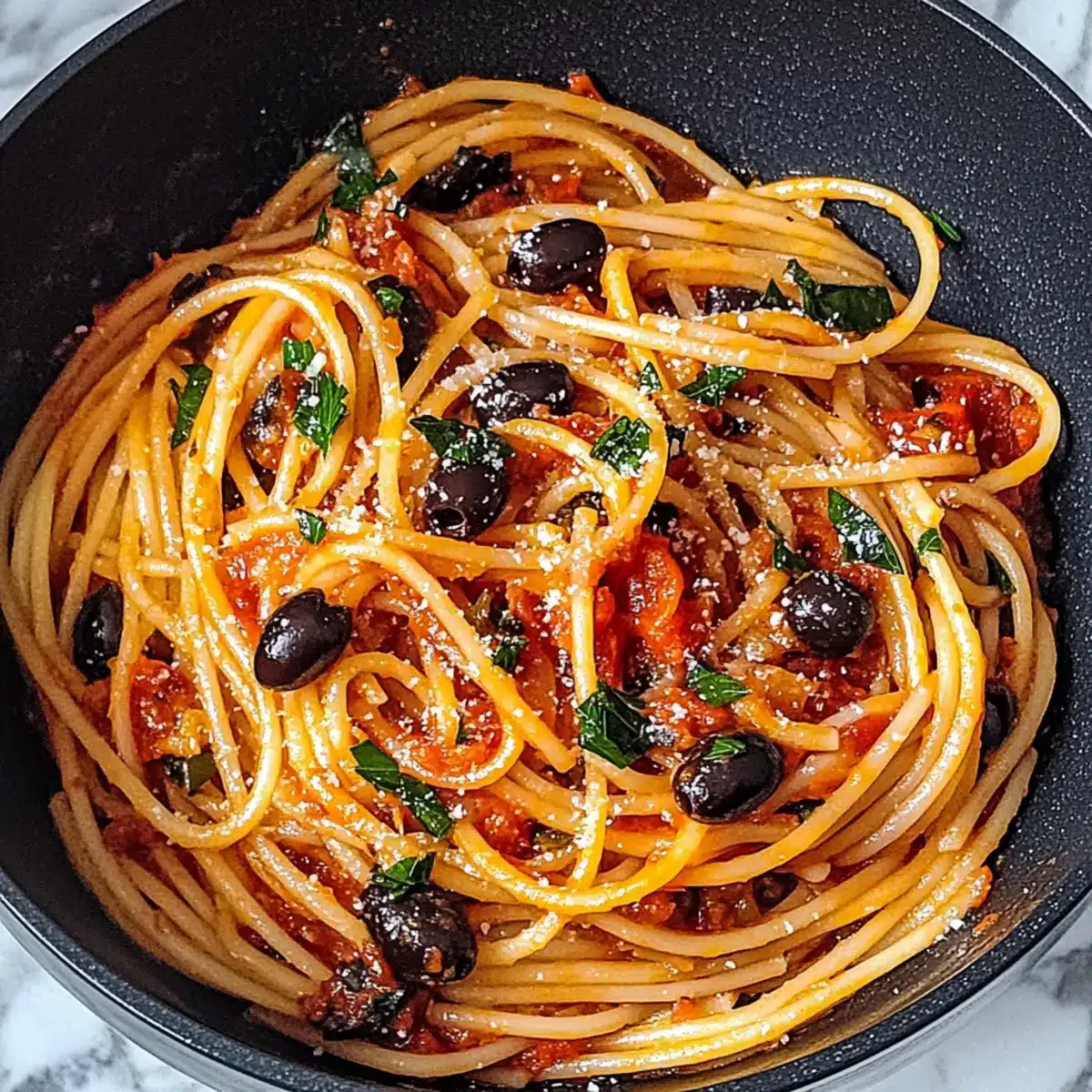 Once the sauce has thickened, lower the heat and add the drained spaghetti directly into the skillet. Toss the pasta with the sauce to ensure each strand is coated beautifully. If the sauce appears dry, gradually add some reserved pasta water to achieve the desired consistency, making sure your Irresistible Pasta Puttanesca is both flavorful and well-sauced.