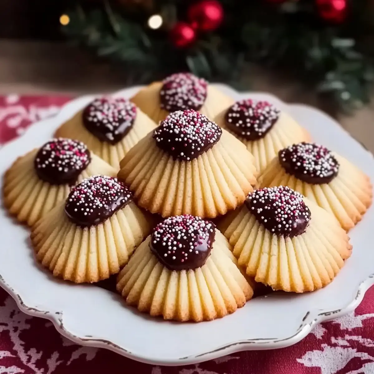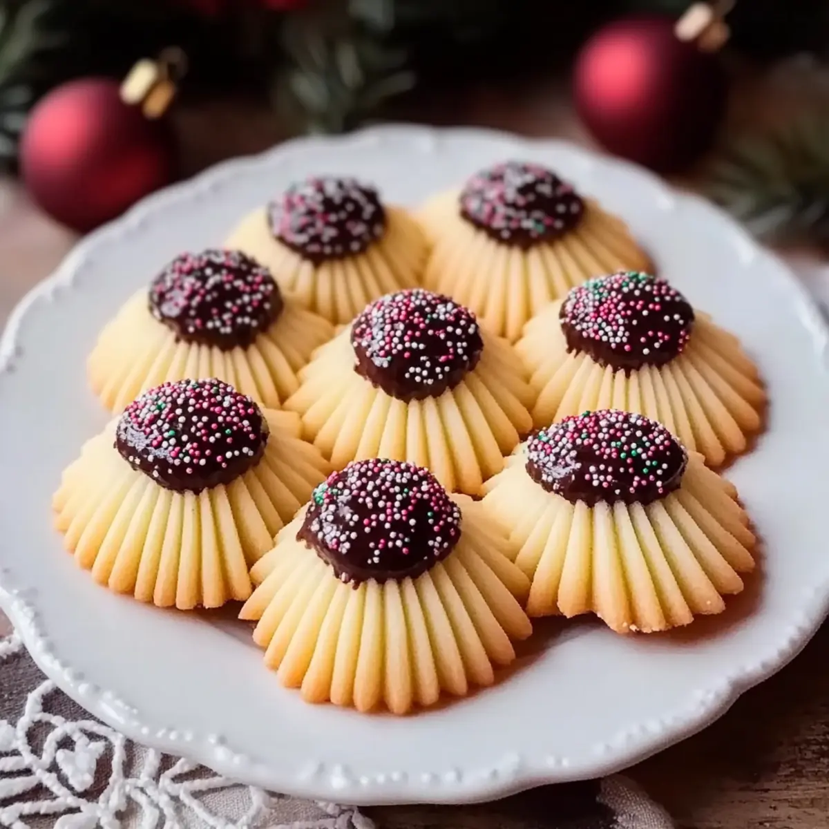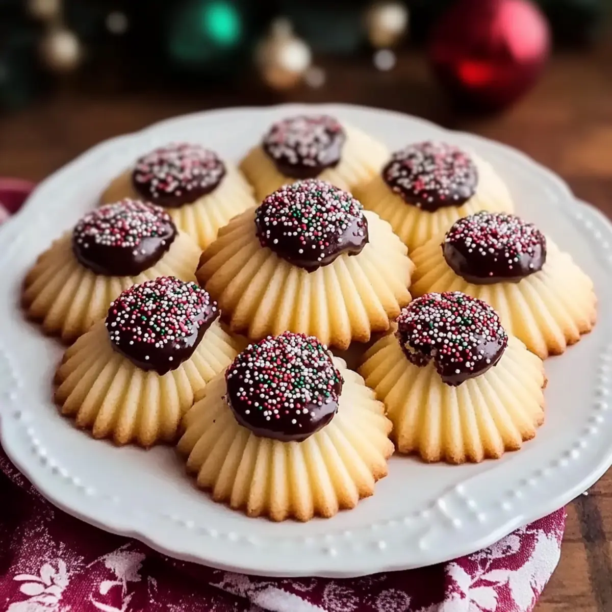 Melt 1 cup of semi-sweet or dark chocolate in a microwave or double boiler until smooth. Dip each cooled cookie halfway into the chocolate, allowing any excess to drip off. While the chocolate is still wet, sprinkle with colorful holiday sprinkles for that festive flair. Let the cookies set completely before serving or gifting.
