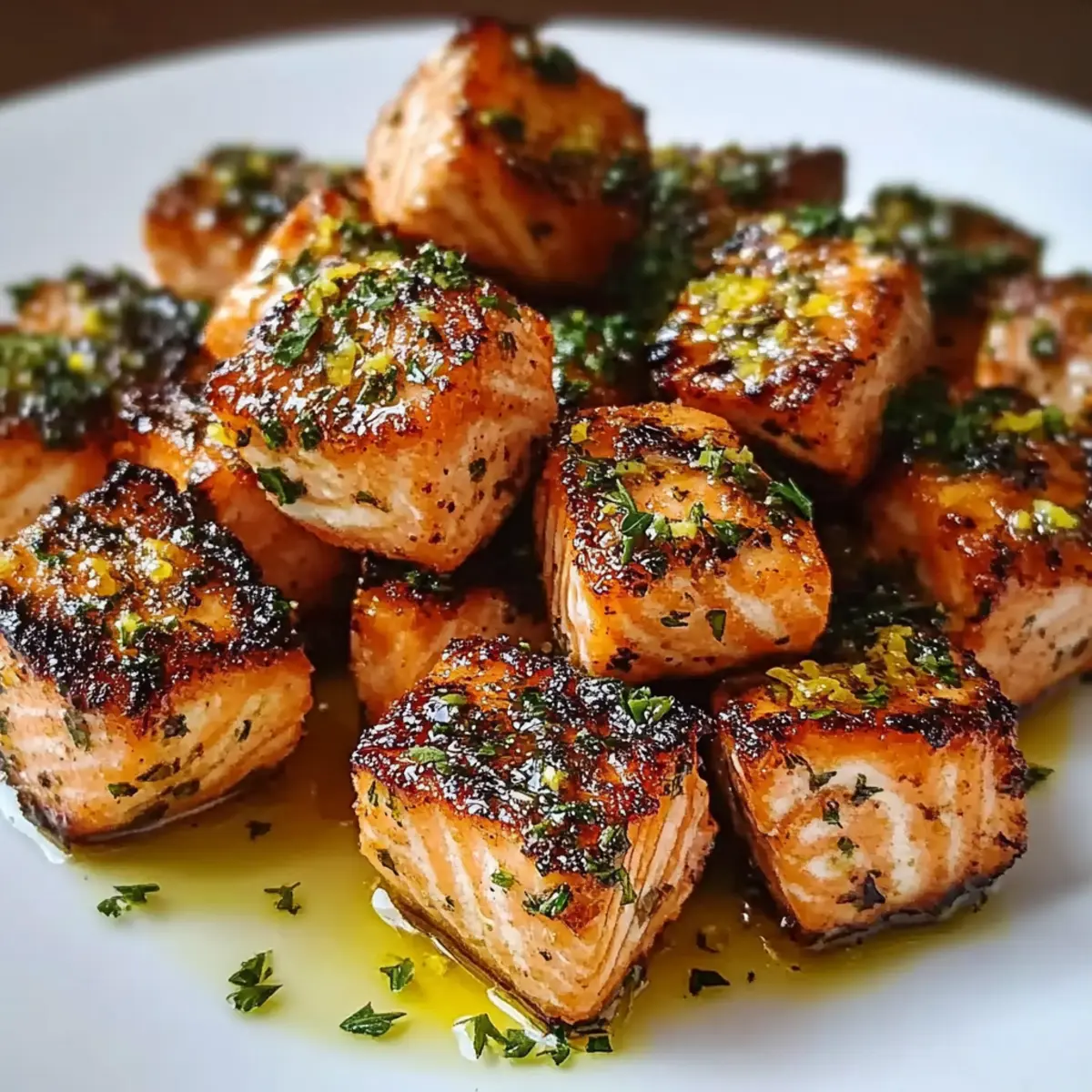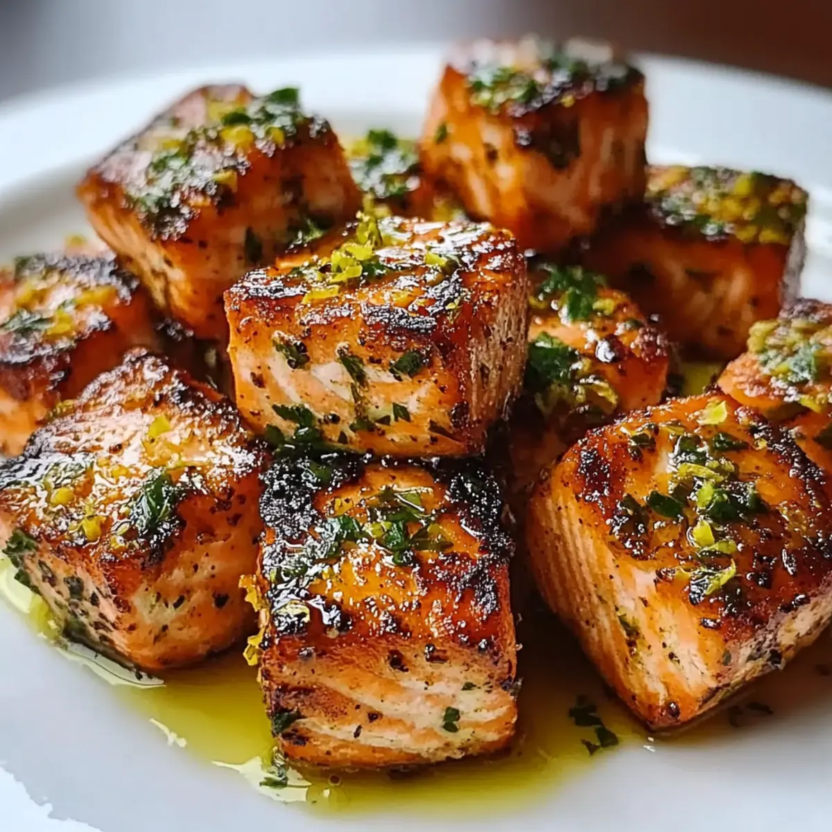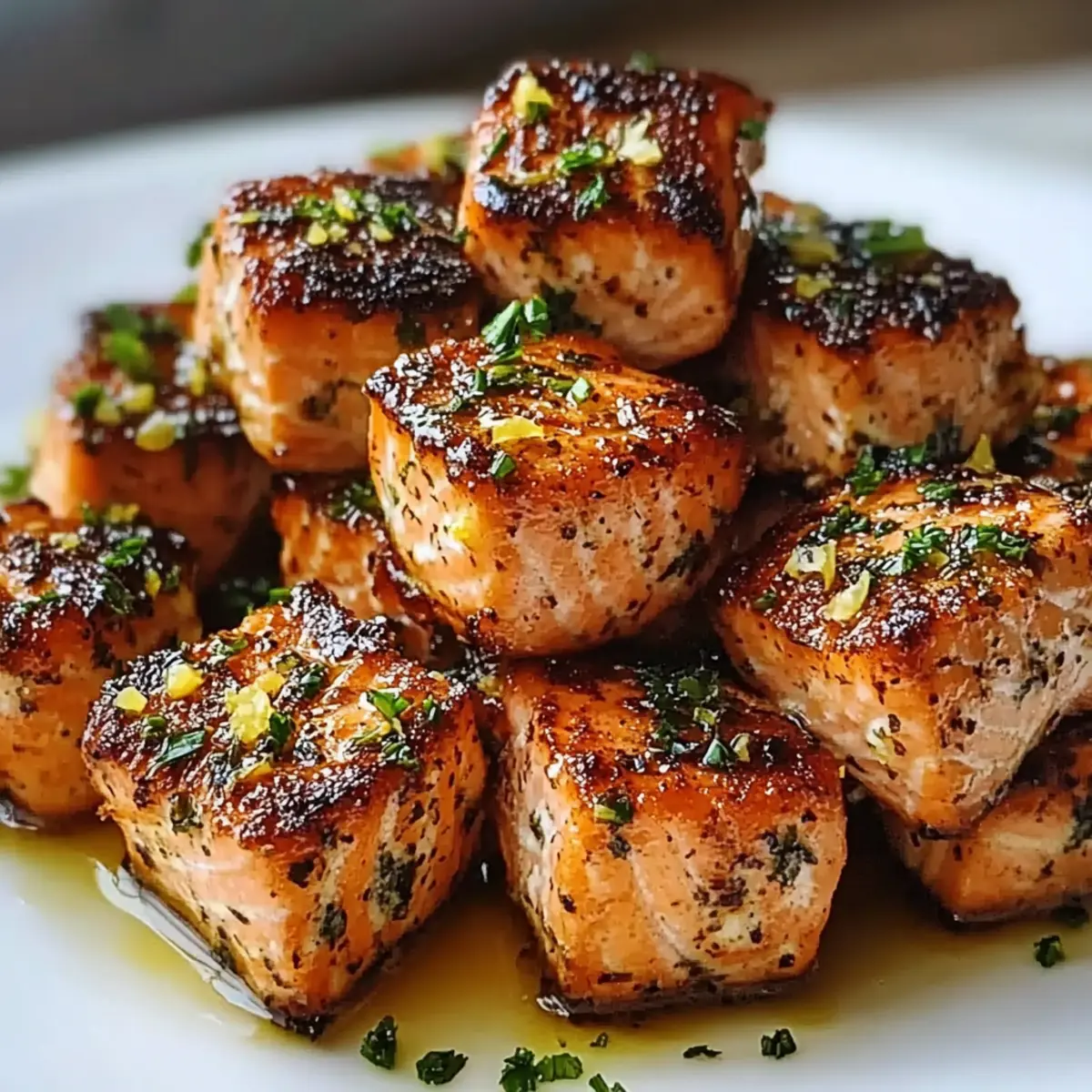 - Transfer cooked salmon bites to a serving platter, garnish with chopped parsley, and serve with fresh lemon wedges.