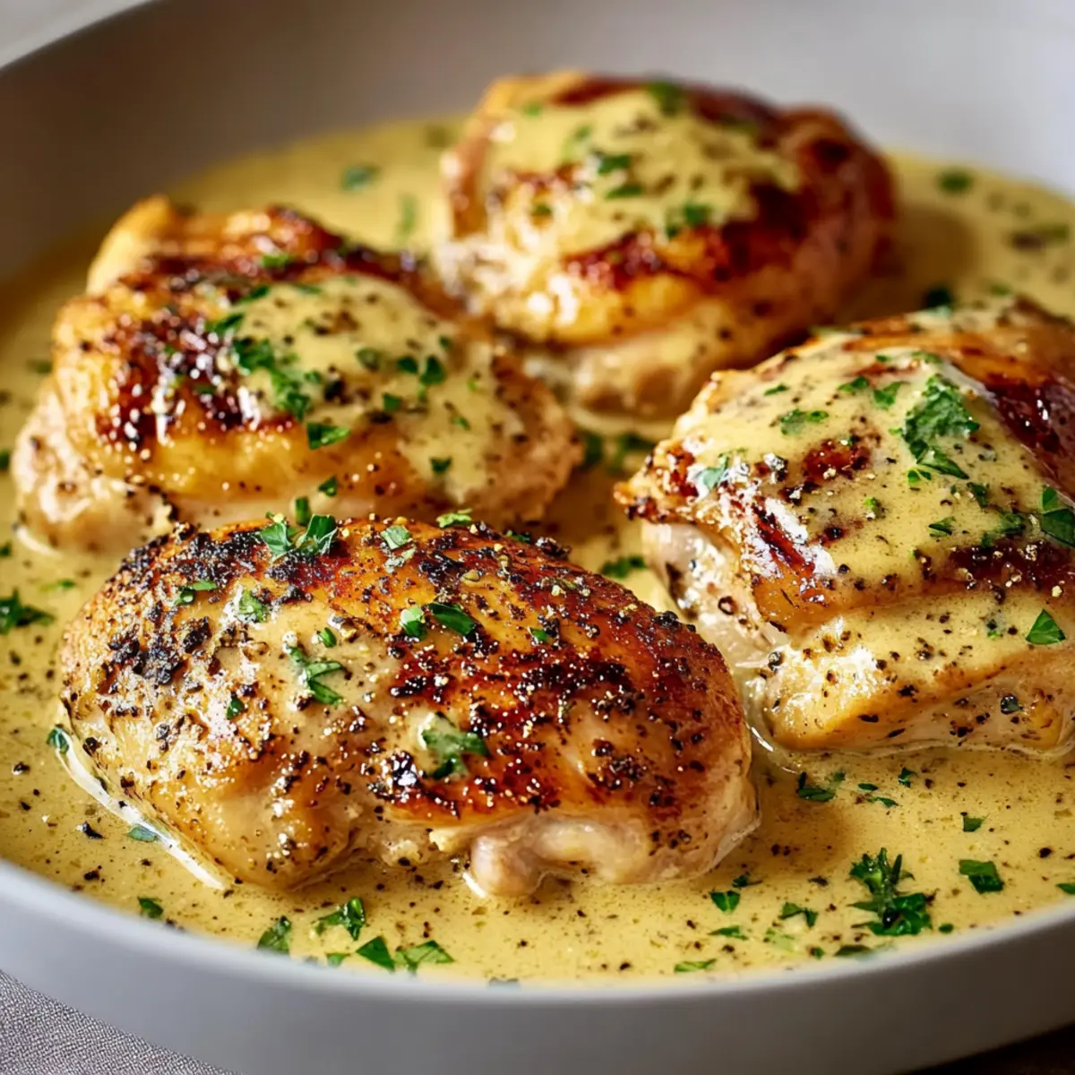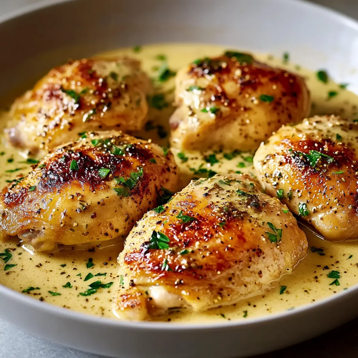 - Return chicken thighs to the skillet, skin-side up, and surround with creamy sauce.