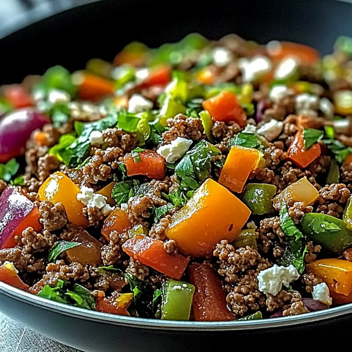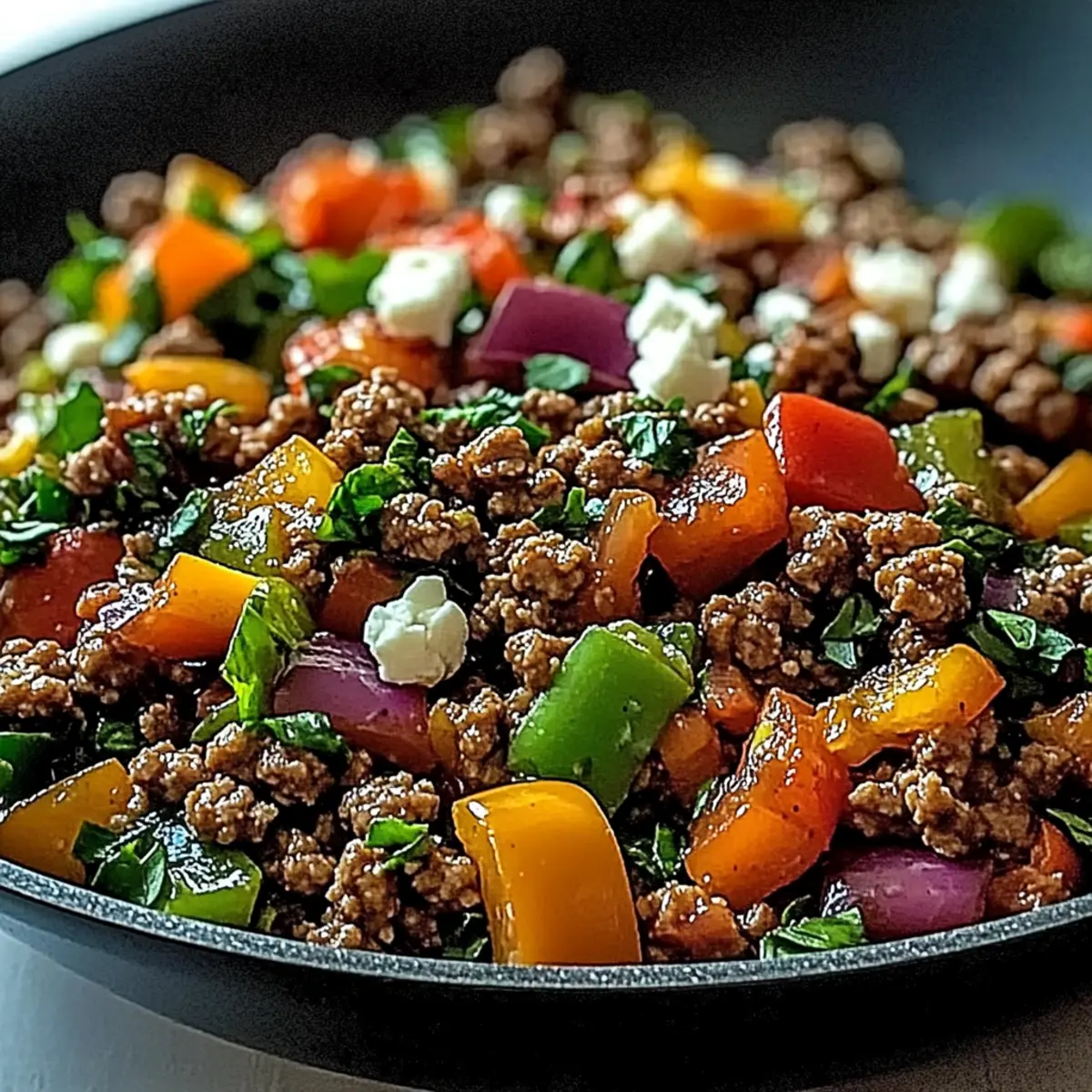 Once all elements are well combined and heated through, taste and adjust seasoning if necessary. Serve your Mediterranean Ground Beef Stir Fry hot, garnished with crumbled feta cheese for a creamy finish or tahini sauce for an extra flavor kick. This one-skillet masterpiece is ready to be enjoyed!