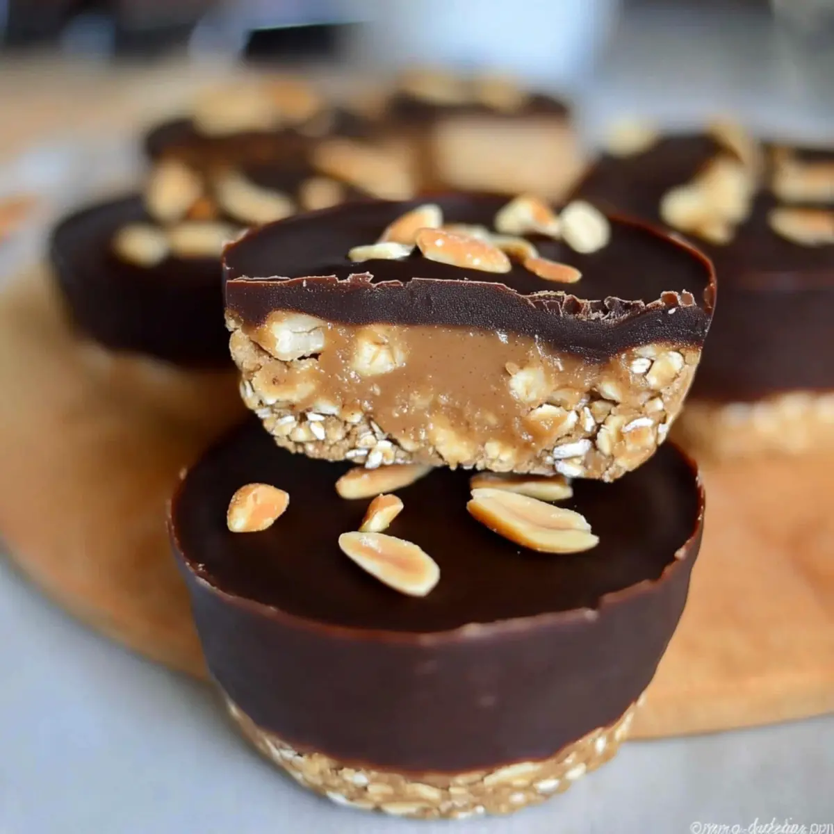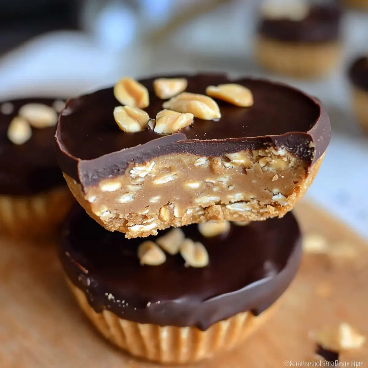 - Add the Chocolate Topping: Drizzle melted chocolate over each oat cup and optionally sprinkle with chopped peanuts.