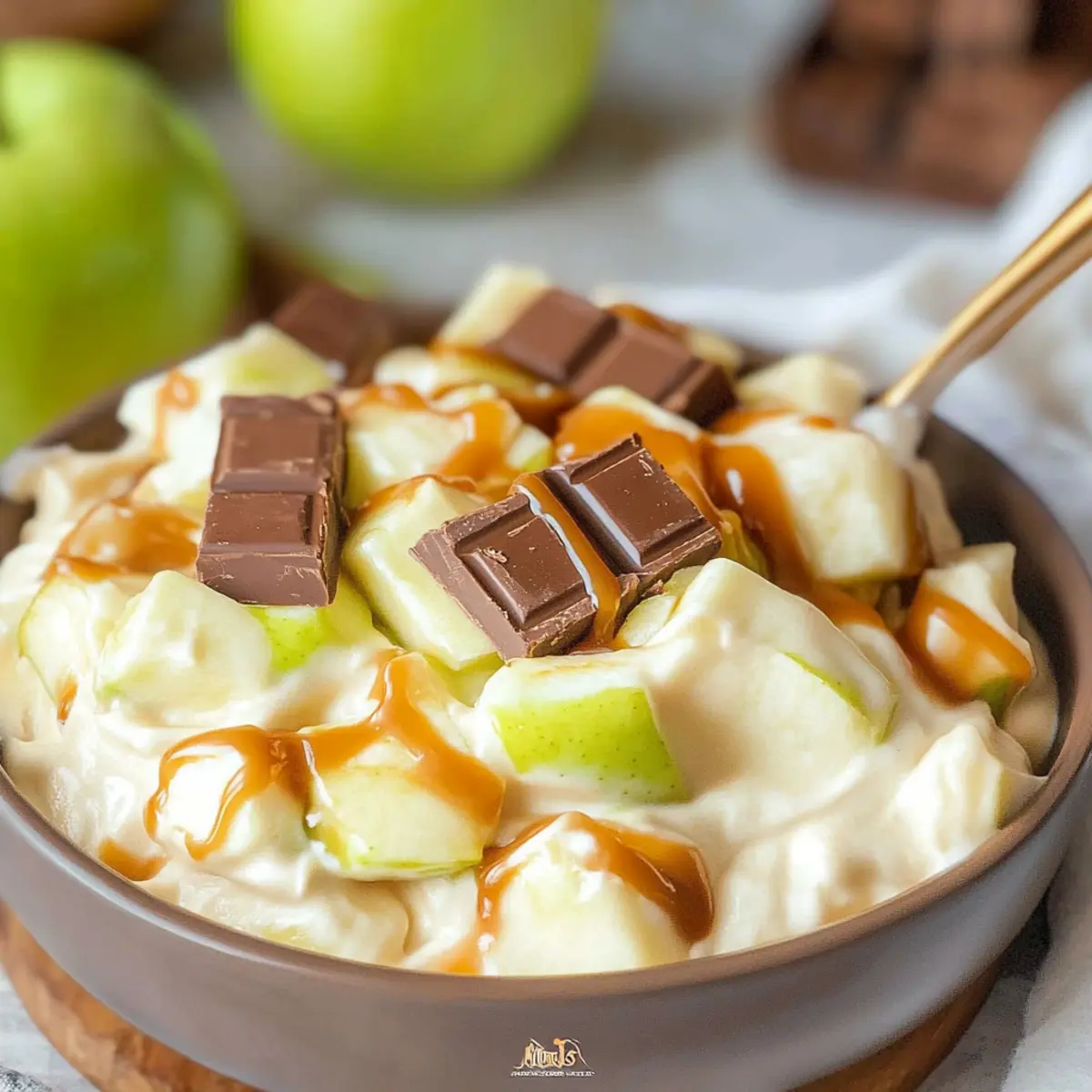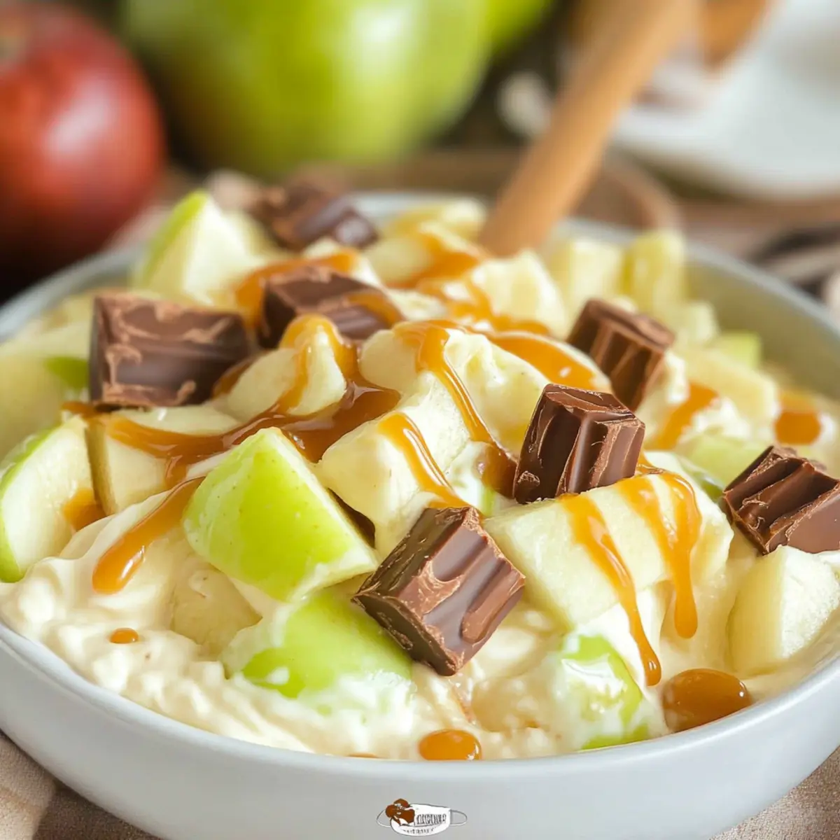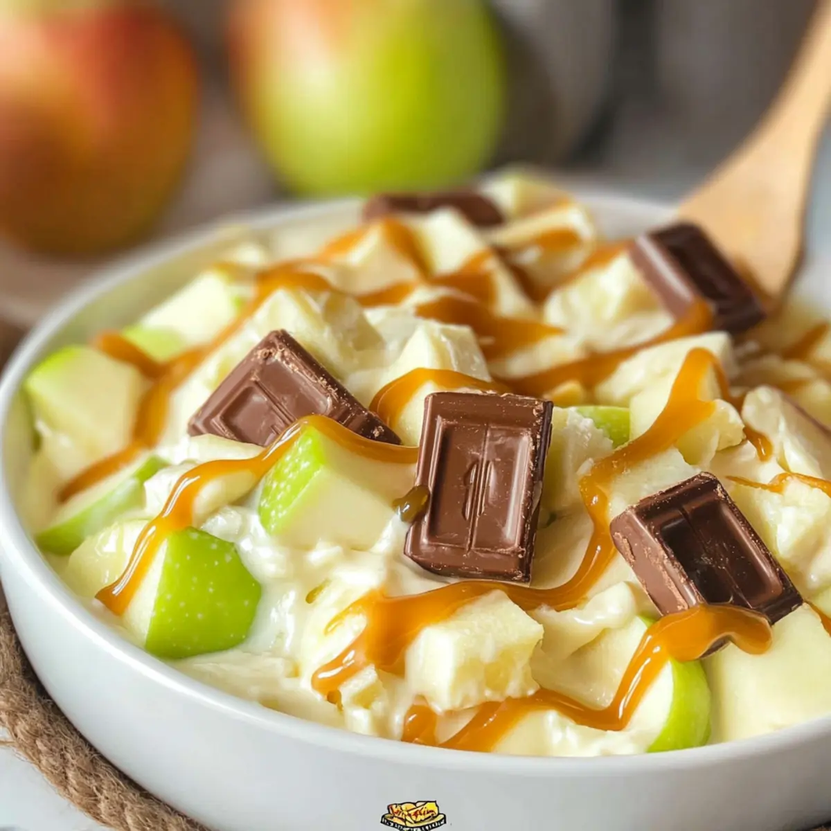 - Before serving, sprinkle the reserved chopped apples and Snickers on top and drizzle with caramel sauce.