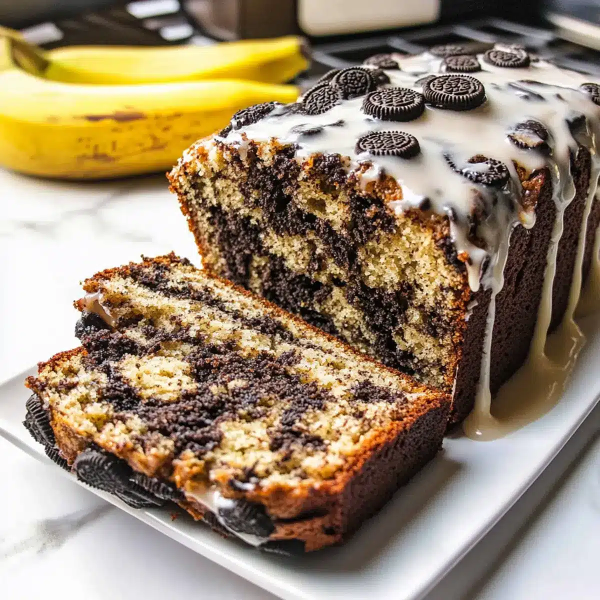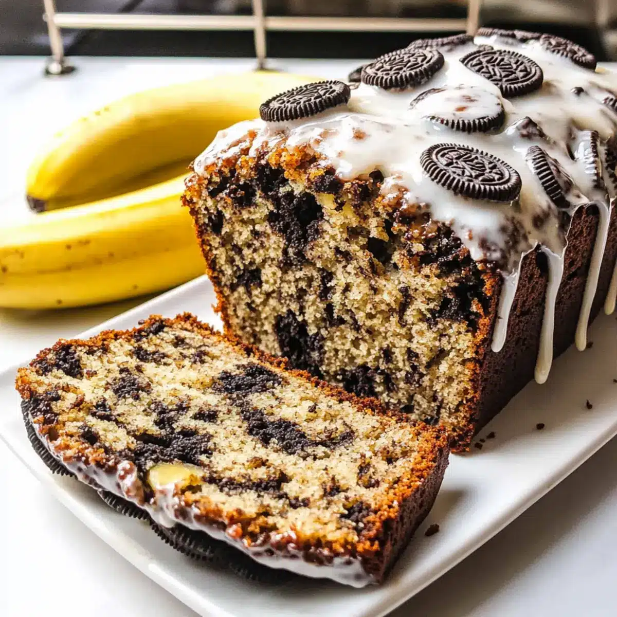 These Oreo Banana Bread slices are perfect for busy home cooks looking to save time! You can prepare the batter up to 24 hours in advance. Simply mix your ingredients as usual, then cover the bowl tightly with plastic wrap and refrigerate. When you’re ready to bake, give the batter a gentle stir to ensure everything is well combined before pouring it into your prepared loaf pan. The glazed Oreo Banana Bread can also be stored for 3-4 days at room temperature in an airtight container; just wait to add the glaze until you’re ready to serve to maintain its delightful texture and sweetness. Enjoy effortlessly delicious slices any day!