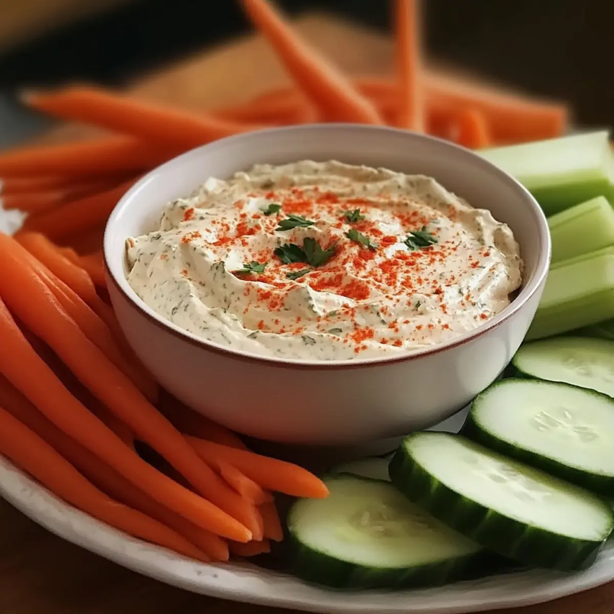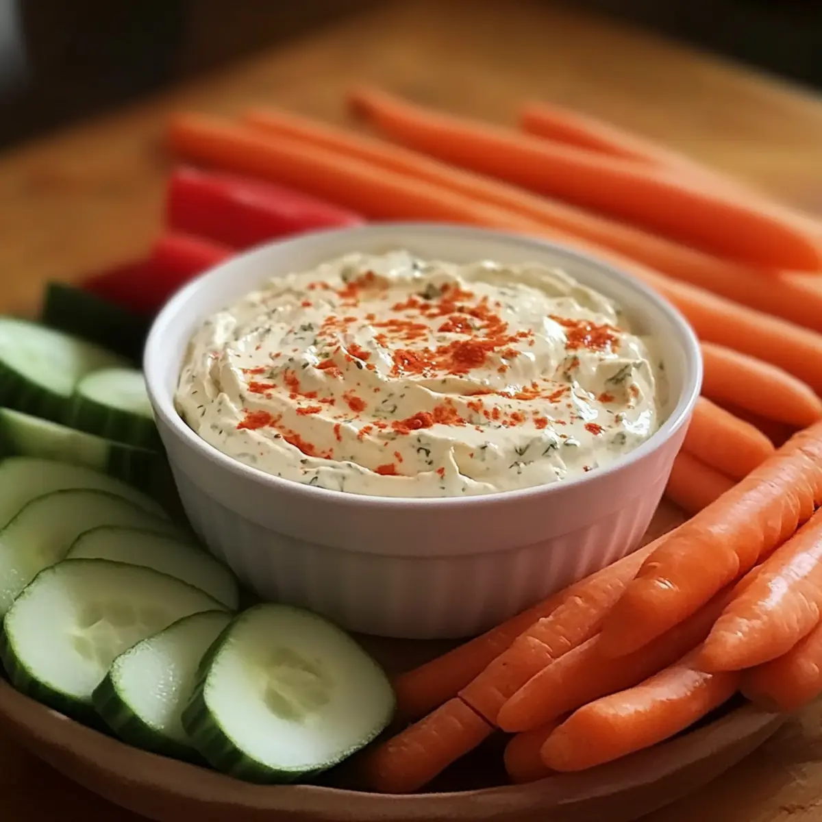 Crispy Veggie Platter: A colorful assortment of carrots, celery, and bell pepper sticks offers a crunchy contrast to the creamy dip.
