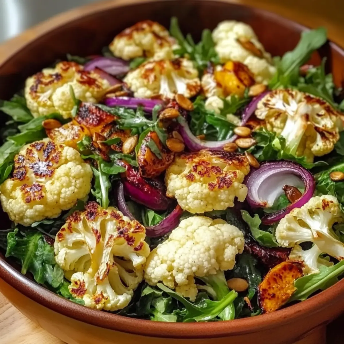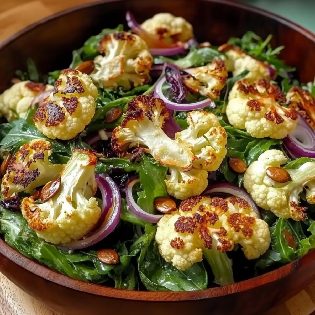 - Once the cauliflower is roasted, let it cool for a few minutes. Combine the roasted cauliflower, mixed greens, red onion, and pumpkin seeds in a large mixing bowl.