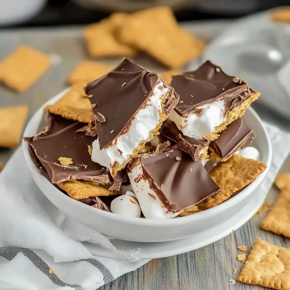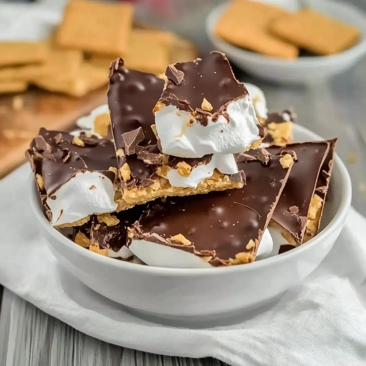 Crumble graham crackers into small pieces and sprinkle them over the marshmallow layer, pressing gently to ensure they stick. This adds a delightful crunch that replicates the traditional s’mores experience. Make sure the graham cracker pieces are distributed evenly to enhance the texture throughout the S’mores Bark.