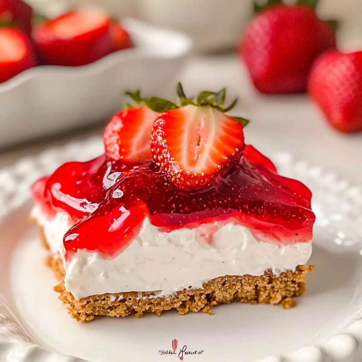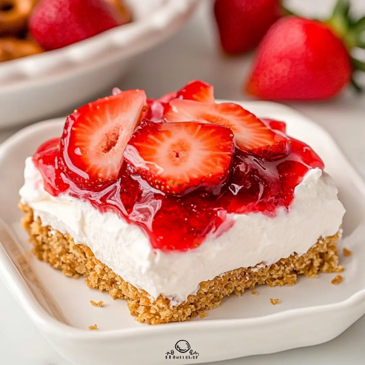 Once the Strawberry Pretzel Salad has set, it’s time to slice into squares for serving. Lift it from the refrigerator and cut it into vibrant squares. Serve chilled to enjoy the perfect balance of flavors—creamy, crispy, and fruity—making it an instant hit at your next gathering!